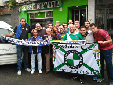 La Peña Internauta #Recre volvió a visitar a sus hermanos de la Peña Cordobamanía con motivo del desplazamiento del Recreativo de Huelva al feudo del filial blanquiverde de mañana. El fin de semana de convivencia comenzó en la tarde del sábado con un almuerzo previo al partido entre el Córdoba y el Elche, que hemos seguido en directo en la sede de la asociación que preside José Luis Llergo.