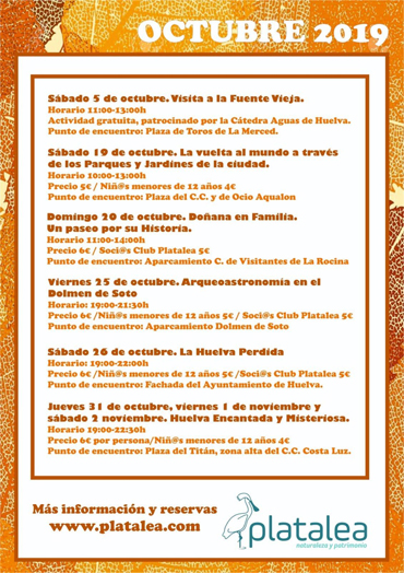 En la imagen tenéis el calendario de actividades de Platalea del mes de octubre, que comenzará el próximo sábado con una visita a partir de las 11:00 a la Fuente Vieja de Huelva capital. Para más información acerca de Platalea y sus actividades, así como reservas de las mismas está disponible la página web www.platalea.com Autor: MauriSoftOpina sobre esta noticia